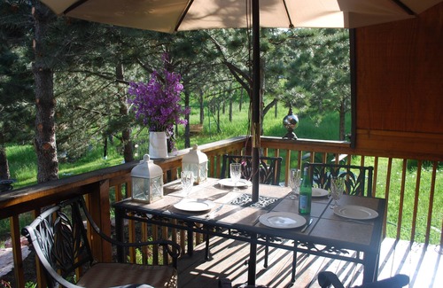 The Chalet on High Meadows is an artistically designed European-styled Chalet nestled in a high meadow of the Black Hills in western South Dakota. This vacation rental chalet graces a peaceful meadow and overlooks the Black Hills National Forest and is approximately 10 miles NW of Rapid City. It is conveniently positioned to the west of I-90 between Rapid City and Sturgis, SD on a well maintained county road. The easy access allows visitors to enjoy top events and attractions yet experience the quiet of the natural setting.