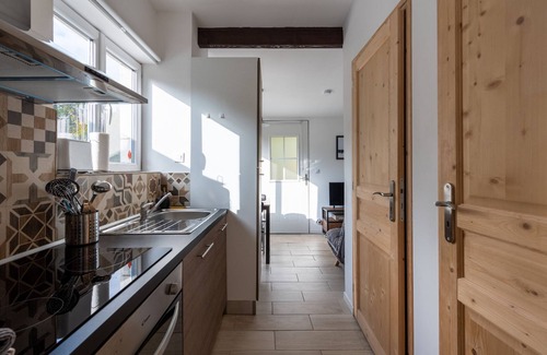The Atelier was renovated in 2019 in a comfortable urban style; inside, you will find a living room with its American kitchen, a room for two people as well as a bathroom and a separate toilet. The living room has a sofa bed equipped with a real comfortable mattress. A large terrace of 20 m2 will allow you to enjoy the sound of the stream flowing nearby and enjoy a view of the forest.