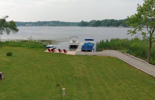 Relax with the whole family at this peaceful place to stay. Situated on beautiful all sports Wolf Lake this newly built space is gorgeous with great views from it's lofty deck.