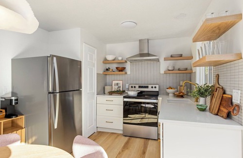 Inside The Chic Retreat, you'll find thoughtful touches and modern amenities designed for a seamless stay. The kitchen is fully equipped with everything you need, from cooking essentials to sleek new appliances, perfect for preparing meals or snacks. Each bedroom has blackout curtains for a restful night’s sleep, and a dedicated workspace provides a convenient spot for work or planning adventures. Enjoy high-speed Wi-Fi and streaming-ready TVs, creating a cozy, connected home-away-from-home atmosphere.