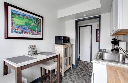 When guests enter the first floor, they'll find a living room with a large flat screen TV and a sofa. Beyond the living room is a bedroom with a Queen bed and TV. There is also a small room off of this room with a trundle bed. The trundle bed has one twin on top and one pull out twin below. Also, from there you'll find a hallway leading to the kitchenette and full bathroom. The kitchenette has a sink, microwave, Keurig coffee maker, and mini fridge. There is also a small table for two! The full bathroom has a shower/tub combo, pedestal sink, and toilet. Next to the bathroom is a 2nd bedroom with a queen bed and closet.