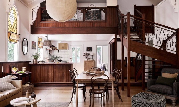 Built in 1927 as a place of worship, the church has been lovingly transformed into a warm and welcoming home. Inside, you’ll find soaring ceilings, original stained-glass windows, rich timber panelling, and even the original confessional - now a whimsical design feature. The open-plan living space is bathed in natural light and styled by Belle Hemming with a mix of vintage and contemporary furnishings, creating a space that feels both soulful and serene.