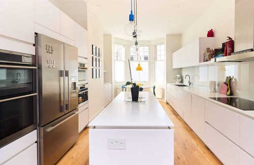 This stunning four-storey home in the heart of Clapham offers a spacious and stylish retreat, ideal for families or groups. Featuring four beautifully designed bedrooms, each with a queen-sized bed, and four and a half bathrooms, the property provides ample space and comfort. The home boasts a generous reception room, a dedicated TV room, and a modern open-plan kitchen and dining area. A private patio offers a tranquil outdoor space, perfect for relaxation. Situated near Clapham Common and Northcote Road, this home is in a prime location with excellent transport links.