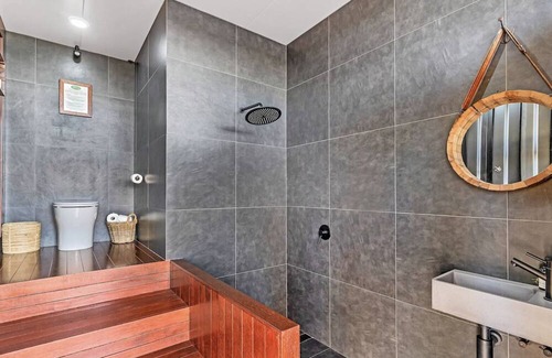 One bathroom with a compost toilet and a shower using only rainwater. Both hot and cold water. Complimentary body wash, shampoo and conditioner by Le Labo, one of the most luxurious exclusive brands out today.