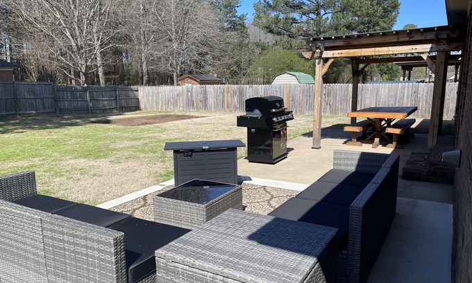 This stylish home sleeps 12 with 3 king size beds and 4 twin size beds & 2 full size futons. There are smart TVs in every bedroom. It offers a large, fenced yard with covered outside dining. Minutes from shopping, restaurants and the interstate.