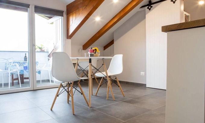 A modern and stylish apartment with a balcony with stunning sea views from which you can enjoy wonderful sunsets . The apartment has a lovely kitchen with all amenities you may require and a dining area .