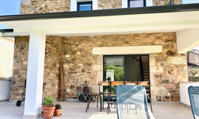 Una Casa de Piedra, totalmente modernizada, en un solo luminoso volumen en su planta baja; cocina, comedor y salón con acceso a una dimensiónala terraza y orientada a un tranquilo y silencioso pulmón verde… En su segunda planta, mirando a la ría, mirando el mar, un cuadro; O Barqueiro, y el sol del atardecer entrando por ese gran ventanal, sentado desde la tumbona invitan a la observación, a la lectura …
