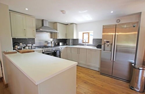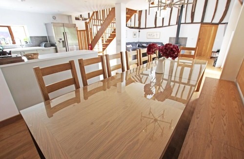 Luxurious barn conversion in Wealden countryside with Visit England gold award. The original barn dates back to the mid 19c and was stabling for a former Coaching Inn. Much of the original features have been retained and the blend of new and old has been managed perfectly by the owners and a team of skilled craftsmen who clearly know their job. You are bordering meadows and forestry with some great walking opportunities directly from the barn. This is a very central location for the whole family to enjoy the stunning English countryside. Free-range chicken and duck eggs, vegetables and home reared meats are available to purchase during your stay. The Farm Spa is a short walk away where you can pre-book a range of massages, facials and therapies for during your stay. The property includes access to a 6-person hot tub in the neighbouring spa, by appointment and for age 18+ only.