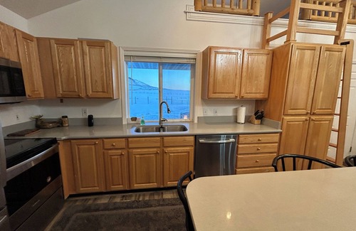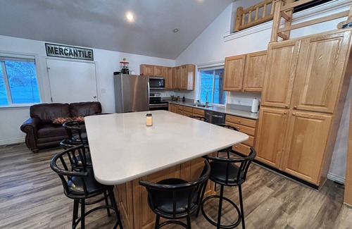 Inside, enjoy modern comfort paired with rustic charm. The newly remodeled kitchen is fully equipped for preparing family feasts, with seating at the table and island for up to 18. Open living spaces and a cozy fireplace invite you to relax after a day of adventure, and with room to sleep 18 comfortably, it’s perfect for large groups or family gatherings.