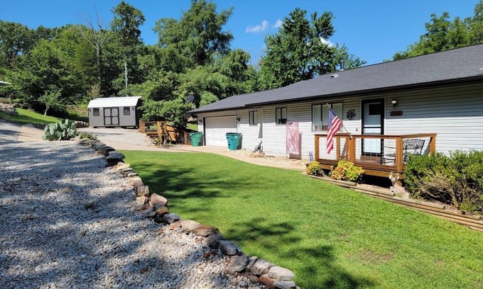 Come and enjoy our 3-bedroom, 2.5-bath, 2400 sq. ft. house in Bull Shoals, Arkansas. Perfect for outdoor families and fishing enthusiasts, with quick access to Bull Shoals Lake. Boat parking/charging station, use the commercial ice machine, fish cleaning table, or kayaks in the garage. Hang out in the “hidden” bar/game room or chill in bedrooms with smart TVs. Relax on our screened-in porches or gather around the backyard firepit. Book your stay in our serene lakeside house!