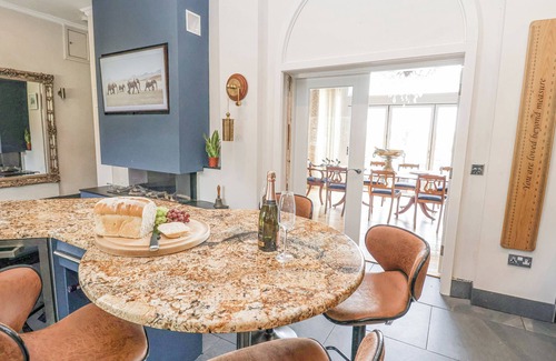 The Colonnade in Trefnant in Denbighshire sleeps 11 people in five bedrooms which include one king-size with ensuite, double with ensuite, a family room with three singles, another family room with one double and one single bed, the fifth bedroom has a single bed, family bathroom with a sauna, walk-in shower, basin and WC. There is also an open-plan kitchen/living room with a gas range oven and hob, integrated electric oven, microwave, fridge/freezer and dishwasher. The utility has a washing machine and there is also a dining room, a sitting room and a snug. Outside, there is ample off-road parking and grounds which include a football field, gardens, an ornamental pond with fountains, a terrace with patio furniture and a covered area with a hot tub, barbecue, pizza oven and beer fridge. Two well-behaved dogs welcome. Sorry, this is a no smoking property. A shop and a pub are both within 1.1 miles. Note: There is a large pond in the grounds. The Colonnade offers guests a truly memorable holiday. Please note: CCTV in operation.
