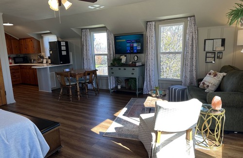 The Compass Loft is a newly refurbished, UPSTAIRS garage apartment with a vintage/travel theme that reflects the spirit of our other Compass listings. We are 3 blocks from TSU and close to the Downtown Square. The Compass Loft has it's own private entrance. The only time our paths might cross are in the driveway or at the base of the stairs if we are on our way to the garage. It's a Studio style floor plan and it has a private, vintage bathroom. The kitchenette has a sink, Keurig, and a mini fridge to hold your leftovers. We offer a Level 2, 210 EV Charger.