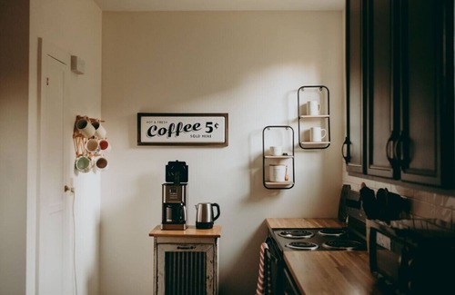 The Kitchen: Fully stocked for any meal you wish to prepare during your stay, this kitchen includes silverware, plates, cups, mugs, cooking utensils, baking sheets, pots, pans, bowls, spices, oil, and more. It also features a 12-cup coffee maker and an electric kettle for tea lovers.