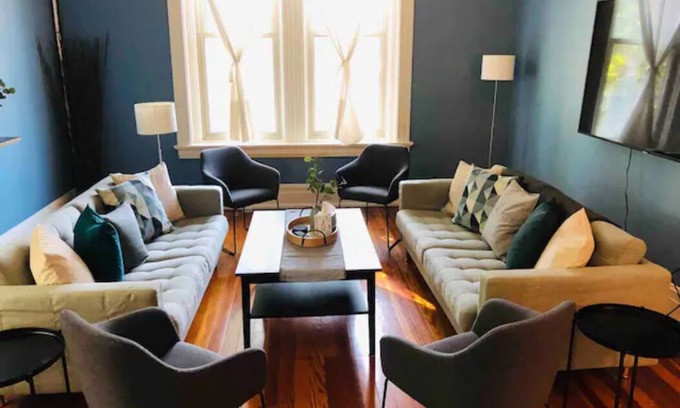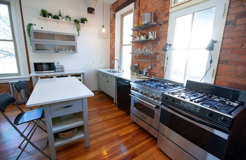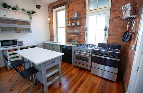 Built in 1887, this former convent has been beautifully renovated to create a unique getaway featuring exposed brick, beautiful hardwood floors, 11-ft ceilings on the first floor, and an abundance of natural light. This house is huge, with 5,400 square feet of living space for your group to enjoy! All bedrooms have queen beds, sitting areas, light-blocking curtains or blinds, and double-paned windows to maintain a quiet and peaceful environment for you. You'll get a great night's sleep!