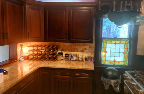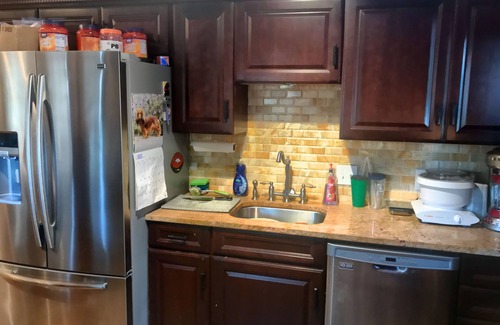 The renovated kitchen offers plenty of pots, pans and utensils to help you make delicious meals. A microwave, tea pot, coffee maker, blender, dishwasher, refrigerator, gas stove, and oven, and dishes are available for you. The open concept guarantees togetherness! And food delivery apps work great to!