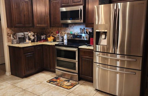 Cozy 3 bedroom, 2 bathroom home in a quiet neighborhood. Fully equipped kitchen that includes electric stove, microwave, refrigerator and dishwasher. Washer and dryer in separate washroom. Jet tub in master bathroom. Large back yard with a comfortable patio equipped with an outdoor kitchen. Two car garage provided. Office area with a large desk and chair and a comfortable chair and ottoman for quiet time to read a book by the window.
