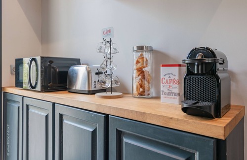The kitchen is equipped with an oven, a stovetop, and a refrigerator, as well as a coffee maker, an electric kettle, and a microwave. Bathroom amenities include a hair dryer, towels, and toilet paper. And you won't have to pack extra clothes, because you'll have a washer and dryer, too. Other amenities include a sofa bed, bed sheets, an ironing board, and soundproofing.