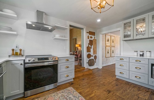 Off the dining room is the kitchen. You may be in a 120+ year old home, but the kitchen is outfitted to our modern conveniences. A full-size refrigerator with water filtration system & ice maker, induction range/stove, dishwasher & microwave are just the beginning of the appliances you will find in this kitchen. The kitchen is fully furnished with everything a chef could need.