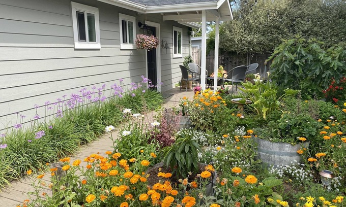 The garden area offers ample seating on the porch to relax with early morning coffee or evening Happy Hour. Fresh herbs & veggies are sometimes available near the walkways to add to your meals. We offer private off-street parking next to the Cottage with easy walkability to the entrance.