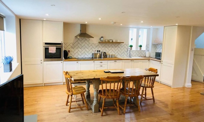 The cottage welcomes you into an open plan living area with smart TV and comfortable sofa. The well appointed kitchen has an electric oven/hob, dishwasher, washing/dryer, coffee machine, kettle and toaster. The large dining table provides seating 6 people comfortably.
