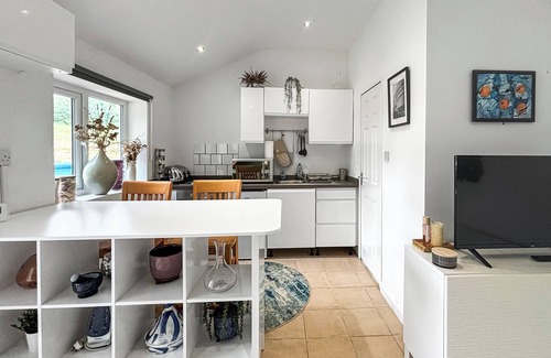 Bedroom area: Kingsize (5ft) Bed, Smart TV Ensuite: Cubicle Shower, Heated Towel Rail, Toilet. Electric central heating, electricity, bed linen, towels and Wi-Fi included. Front garden with sitting out area and garden furniture. Private parking for 1 car. No smoking. Please note: The property has a £100 security deposit.. Escape to this stylish bolthole for two in Merstham, near Redhill, East Surrey, perfect for a tranquil getaway or base to explore the wider area. Nestled within a gated property, this stylish studio accommodation is designed for two people and offers the ideal blend of comfort and convenience. The contemporary open-plan space includes a modern kitchen with a breakfast bar, a cozy seating area with a Smart TV, and a comfortable double bed, all thoughtfully arranged to create a welcoming retreat. Step outside to a small patio with chairs, where you can enjoy your morning coffee or unwind in the evening with your favourite tipple. The cottage is set within shared grounds that extend over 6 acres, providing ample space for relaxation and exploration.