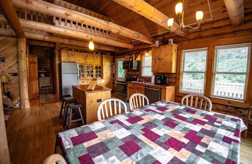 Upon entering the cabin, you'll discover three distinct private bedrooms (two on the main level and another on the lower level), complemented by a loft-style bedroom. (4 rooms total) The cabin boasts two bathrooms, one on the main level and another on the lower level. A fully equipped kitchen, a dining area, and a spacious great room featuring a gas fireplace with the Romantic and cozy interior. The Rustic Lodge is a must see!