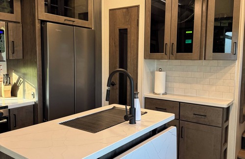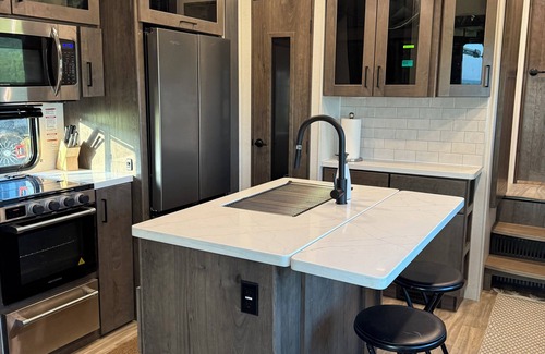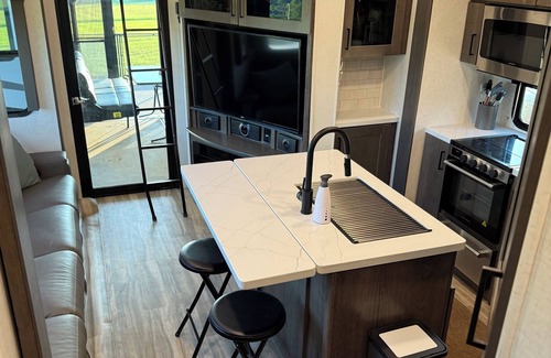 Cozy 2022 camper in a country setting—perfect for a 1–4 night stay. Features a camper king bed, extra-long twin loft, full bath with oversized shower, full kitchen with stainless appliances, island, pantry, fireplace, heat & A/C. Two TVs & Firestick (hotspot needed). Great for couples, solo stays, or quick small family trips. Stationary unit—ideal for relaxing, recharging, or a comfy crash pad.