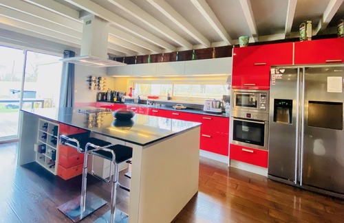 On the ground floor: large living room with open kitchen of 80 m²entièrement equipped, decorated with a central island, living room with two sofas, square dining table for 10 people, pellet stove, flat screen TV. Room with air conditioning. Attached to the main room, there toilets, bathroom with Italian shower, elliptical bicycles available and a bedroom with double bed.