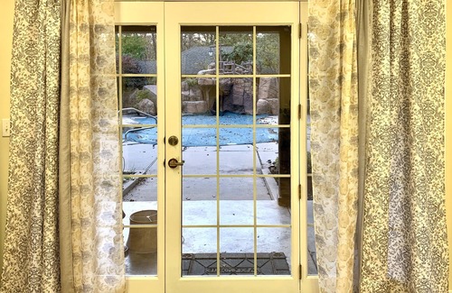 The guest house is attached to the main house via a breezeway. There is a covered pavilion where you can grill and eat. The courtyard has a pool that is open from May through late September. We have over an acre fenced in backyard with a walking trail. The home is pet friendly. Friendly pets can run free in the backyard but need a leash around the courtyard/pool area.