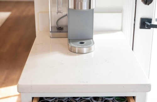 Through the oversized kitchen, and past the Keurig coffee machine, is the game room. It features a very sturdy pool table, air hockey table, tic tac toe board, and another door for backyard/pool access.
