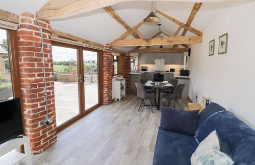 The Cow Shed, a single-storey dwelling, has an open-plan kitchen, dining area and sitting area, a communal utility with freezer, washing machine and tumble dryer, a double bedroom, a twin, and a shower room. Appliances consist of an electric oven, gas hob, microwave, fridge with freezer box, dishwasher and Smart TV. Outside there is a shared courtyard with furniture and ample off-road parking. One small-medium sized dog is welcome and this is a smoke-free property - there is a designated outdoor smoking area. WiFi, fuel, power, bed linen and towels are all included, along with a highchair. You'll find a shop in 1.5 miles and a pub in 1.7 miles. Retreat to rural Herefordshire at The Cow Shed. Note: The freezer, washing machine and tumble dryer are housed in the communal utility. Note: There is a step to the exterior of the home and inside one shallow step internally. Note: Please keep dogs on a lead when outside.