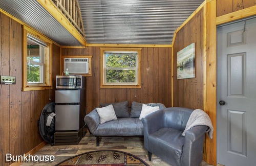 Bunkhouse has a small porch with chairs and a box of lawn games, and plenty of room for outdoor activities with a fire pit and sports equipment available such as an adult and kids horseshoe pit, footballs, etc. Picnic table and hammock for lounging and hanging out. Charcoal grill available. The outside area has a lakeview.