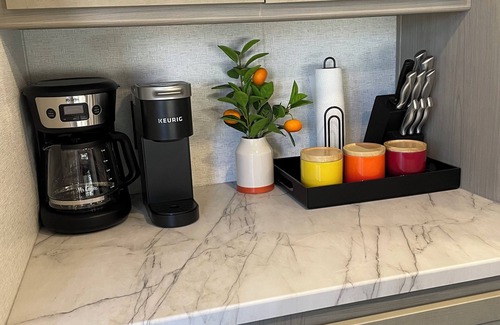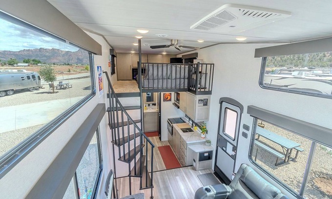 Wake up to breathtaking sunrises over the red rock mountains, enjoy your morning coffee on the private deck, and unwind under the stars by the fire pit or relax in the pool and soak in the hot tub after hiking. Take pleasure in the open layout, large windows, lofted bedrooms with a comfy queen-sized bed, fully-equipped kitchen, and modern bathroom. You’ll have all the comforts of home in a compact and stylish space.
