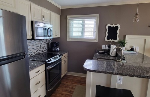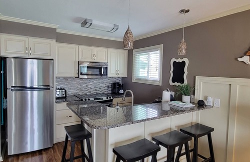Your fully equipped kitchen has updated stainless steel appliances, i.e. microwave, fridge, stove, and dishwasher as well as garbage disposal for all your cooking needs. There's no need to worry about cookware, flatware, or even dinnerware. For further convenience, the stainless steel cookware is both ovenproof and dishwasher safe. Don't forget to bring your favorite K-cups! The kitchen has both a coffee maker and a Keurig to prepare your favorite cup of morning Joe. For intimate dining, bar stools located at the counter are at your disposal.