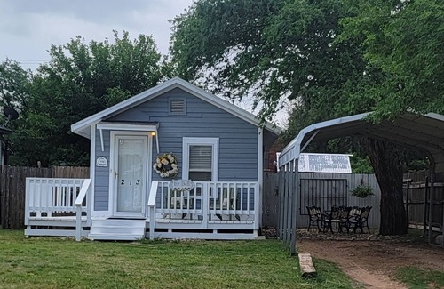 This Beautiful Cozy cottage is located in the small town of Post City Texas. Located a few blocks from downtown and walking distance to a local United Grocery store. The Cottage is a small house, with a queen size bed, side table, dresser, a side chair and an Armoire. The Bathroom is small, but has a large walk in shower. The kitchen is set up with lots of cabinets and comes complete with a small table and 2 stools, it has a large refrigerator, an apartment size stove and a Microwave