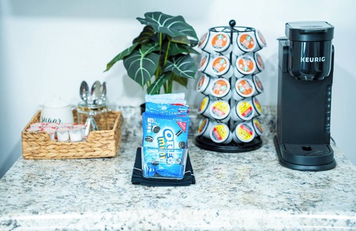 Start your day with a fresh cup of coffee or tea from the stocked drink station, or unwind in the evening with a glass of wine on the cozy patio. The kitchen is fully stocked with upgraded appliances, cookware, and everything you need to cook meals and feel right at home.