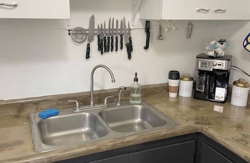 This house has two bedrooms. The primary bedroom has a queen bed to lounge in while watching tv from bed. The second bedroom is the bunk room; There is a twin bunk bed, a twin day bed and a twin trundle all available for use. The house has one shared bathroom for all but the bathroom is well spaced with a full bath and washer and dryer located there also. The kitchen is fully equipped to accommodate family meals.