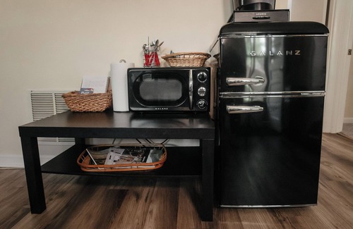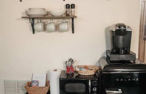The economy kitchenette designed for practicality is complete with a microwave, mini fridge, and Keurig coffee maker. You will also find dishes, wine glasses, cutlery and basics like sugar, salt&pepper, and creamer.