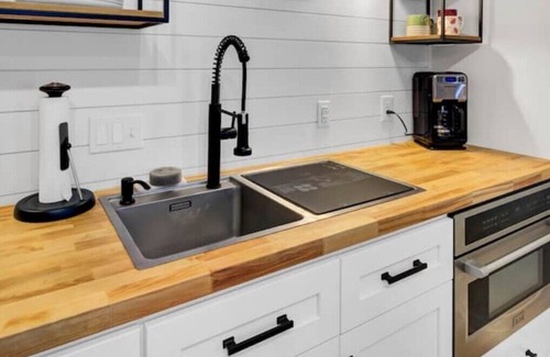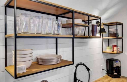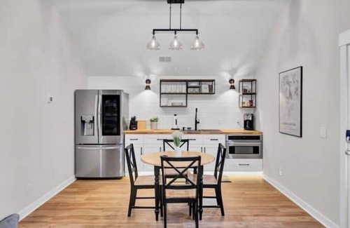 Upgraded open floorplan guesthouse above our detached garage with a private entry. Comfortably sleeps two, but can accommodate five in a pinch. Features a private full bath, kitchenette (hotplate provided, but no stove top).