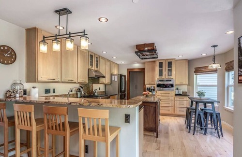 This home has 4 bedrooms that are all equipped with memory foam mattress toppers. The master bedroom has a King bed and the other 3 bedrooms have Queen sized beds. 3/4 of the bedrooms include your own dedicated workspace with access to speedy wifi and a wall mounted Smart TV for your enjoyment. We also have to offer a fully stocked gourmet kitchen with high end appliances and an assortment of kitchen utensils you are welcome to use to prepare delicious home cooked meals if you don’t feel like going out. The custom built cabinets and kitchen island give you that “at home” feel which is extremely welcoming. We have plenty of dishes, pots, pans, bakeware, etc to prepare any meal you can think of.