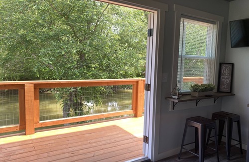 This tiny tree top getaway has a king bed, two twin beds, a fold out sleeper and a queen size air mattress. Enjoy the full kitchen or cook on the grill. After you paddle up and/or down the easygoing creek you can wash off in the outdoor shower.