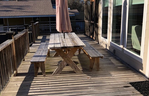 lA roomy elevator connects the two stories to facilitate easy access for luggage, groceries, and guests with limited mobility. Downstairs includes a large bedroom with 2 twin beds and a small living area with two rocking chairs, as well as a full bath, laundry area, and a double-car garage. One bay of the garage is reserved for the owner. The other bay is open for guests’ use. Downstairs also has a 10’ by 40’ ground-level deck with a teak table and 6 chairs. Next to the downstairs deck is a very roomy outdoor enclosed (private) shower with hot water for the adventurous soul. The shower is also great for families coming from the beach or ball games.