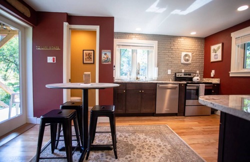 This private retreat offers a beautiful yard with a porch and patio along the creek, fire pit, and large beautiful garden(you may see our friendly gardener from time to time). The Creekside Cottage is best fit for families as the downstairs bedroom has access to the stairs leading to the upstairs bedroom. It may be worth noting that this house was built in 1910 and the upstairs ceilings are low(6 ft. 6 in.)