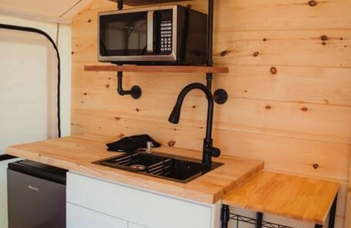 The Creekview safari tent is located inside Campsite 1. Each campsite has 4 tents. Campsite 1 includes a firepit with 12 Adirondack chairs, private covered pavilion with dining table, outdoor sofa and chairs, gas grill, pizza oven, and blackstone and water spigot. There is a hot tub and sauna and corn hole for your use as well as parking. A large cooler is provided at your tent to use. There is wifi and a tv in each tent as well as a drip/keurig coffee maker with complimentary coffee pods. The kitchenette consists of mini fridge, sink, and microwave. Basic, plastic plates, bowls and cups provided. Linens and bath towels are provided.