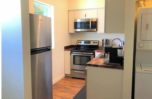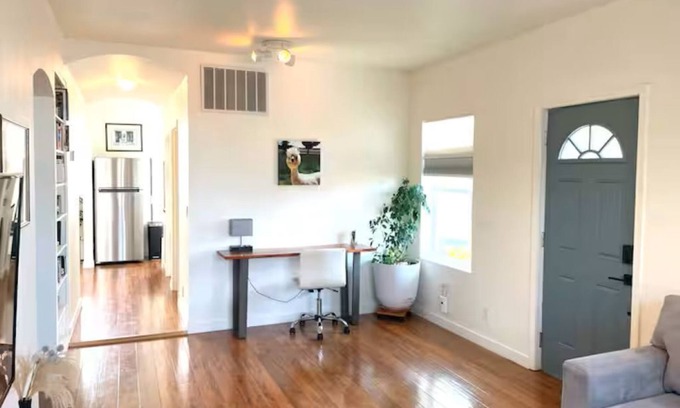 This recently renovated 1-bedroom duplex offers a comfortable and convenient stay, just minutes from all the city has to offer. You'll appreciate the modern touches like hardwood floors, butcher block countertops, and stainless-steel appliances. The cozy living space includes a large bedroom with a king-sized bed, a bright galley-style kitchen, a dining area for four, and a living room with a sectional sofa and smart TV. There's even a dedicated work area with a desk and fast internet.
