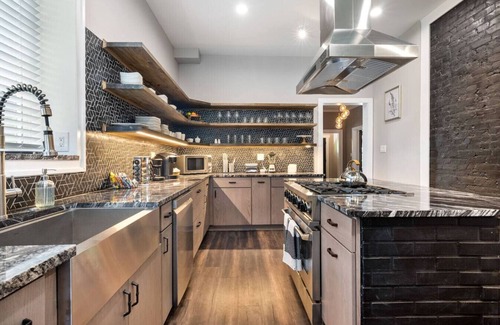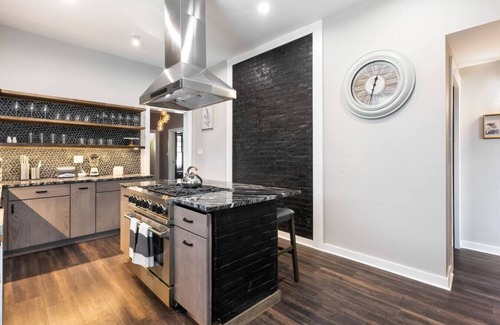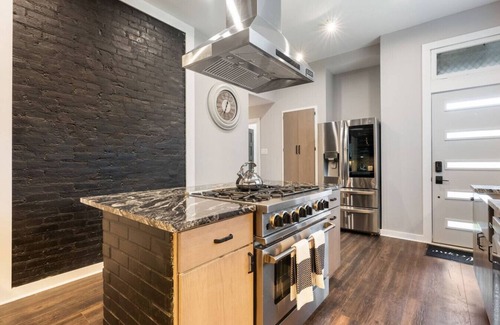 Going through the foyer you will run right into the huge gourmet kitchen with all brand new cabinetry, open shelving, and an enormous island for your cooking and entertaining delight! The island has three stools and a built upscale Bluestar range. The range hood is both attractive and functional to ground the room. The kitchen is well equipped for the guest who would like to whip up a family dinner, or serve carry out!