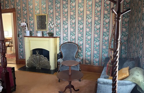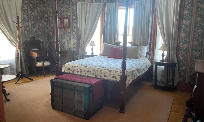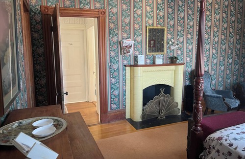 Named after the Cummings family, this stately guest suite features a working fireplace and a spacious, attached bathroom with a walk-in shower. The room includes a seating area to relax and unwind, as well as a writing desk. The queen-sized bed is comfortable, and the period furniture adds a cozy ambiance to the room. Through the bay windows, guests can enjoy breathtaking views of the Piscataquis River.