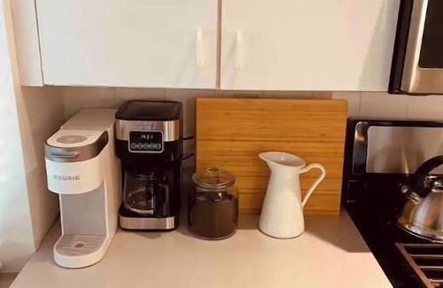 The space includes a full kitchen and living room on the main floor. The second floor starts with a spiral staircase and features an ultra comfortable King bed, full bath, and large walk-in closet. All basic cooking essentials, coffeemaker with fresh roasted coffee, linens, towels, iron, hair dryer, shampoo, conditioner, body wash, high speed internet, and a 48" SMART TV, and record player with records are provided. Free washer and dryer, with complimentary laundry detergent, are located in the basement for your use.