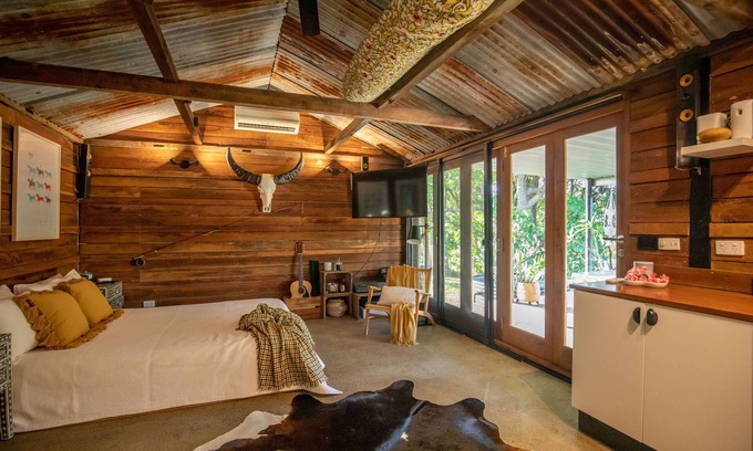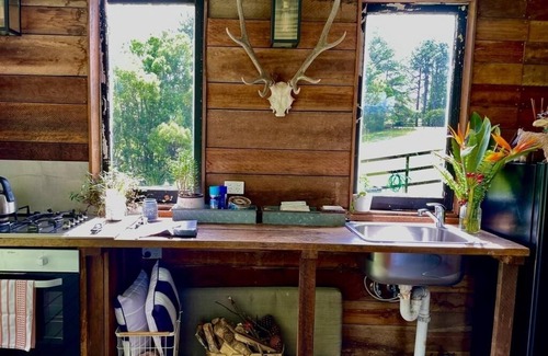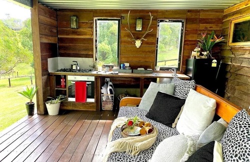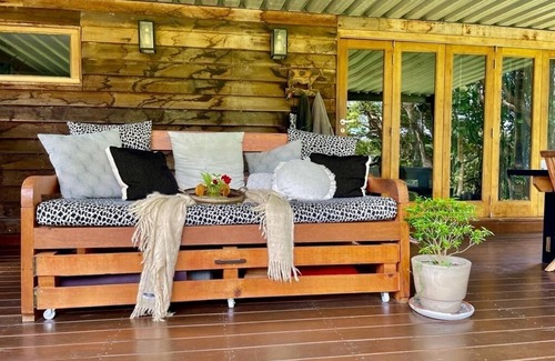 A beautifully renovated Dairy Cottage on 15 acres, with lovely rolling hills. Tastefully decorated with exposed beams and rough sawn hardwood feature walls, the cottage features a luxurious queen bed and en suite bathroom, fully equipped outdoors kitchen, lounge and dining area. Make the most of the warm and gorgeous Sunshine Coast evenings while you kick back for a sundowner on your generous covered deck or in the communal Sunset Lounge, enjoying the tranquil views through fruit trees down to the creek. This cottage is perfect for those couples looking for a quiet and relaxing getaway. No need to eat out, instead make a home cooked pizza in the quick and easy to use commercial pizza oven in the shared alfresco dining area.