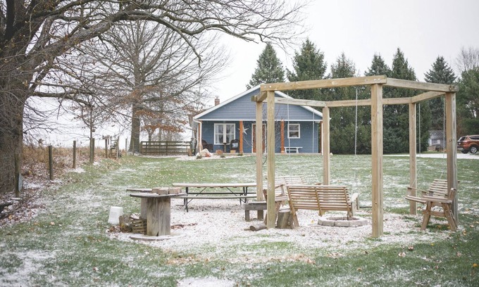 The Daudy Haus comes fully equipped for modern living with WIFI, two smart TVs, heating and air conditioning, coffee maker, microwave and fully furnished kitchen. The kitchen includes baking sheets, pans and skillets, bowls, utensils, plates, cups, coffee mugs and full spice rack, glassware, dish soap and dishwasher pods. It has a full size refrigerator, stove and dishwasher, measuring cups and kitchen linens to make cooking your own meals easy and efficient. A spacious living room with TV, chairs and couch plus the perfectly placed table for two make the Daudy Haus ideal for a romantic getaway or a retreat from the fast–paced everyday life. The bedroom features a queen-size bed, with cozy bedding, extra pillows, TV, large closet and a view! An adjacent bathroom has plenty of counter space, a hair dryer, a walk-in shower, toilet paper, and bath towels for your stay. The large mudroom holds the washer and dryer, another large closet and some games tucked into the cabinets for the quiet nights in. Just steps from the front door is a large fire pit with porch swing seating that is available upon request.